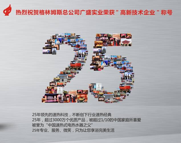 经过近一年的努力,广盛实业成为2012年第一批获得该认定的企业,也是速热式电热水器行业唯一一家获得此称号的企业,不仅仅标志着公司产品技术研发能力、产品技术含量又到了另一个高度,更标志着格林姆斯品牌产品的科技含量达到了行业的另一个无法逾越的高峰。